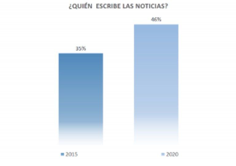A su vez, 46 de cada 100 noticias fueron escritas por mujeres, resaltan las coberturas locales y nacionales. Esta estadística representó un aumento comparado al 2015, ya que, en ese año solo 35 de cada 100 noticias eran escritas por mujeres. Si bien, el aumento no fue grande, sí resulta significativo, pues disminuye la brecha de desigualdad entre hombres y mujeres.
