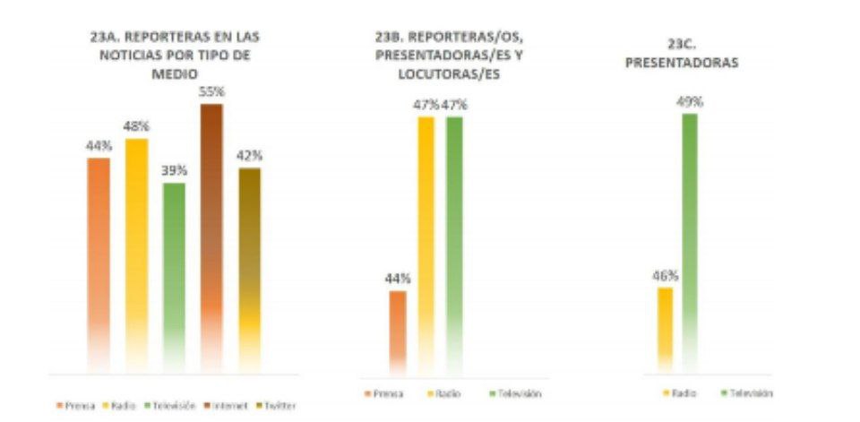 En el caso de las mujeres como reporteras en medios digitales se logró superar el 50%. En cuanto a los espacios de radio y televisión, las presentadoras y locutoras se quedaron a 3 puntos porcentuales de lograr la paridad.