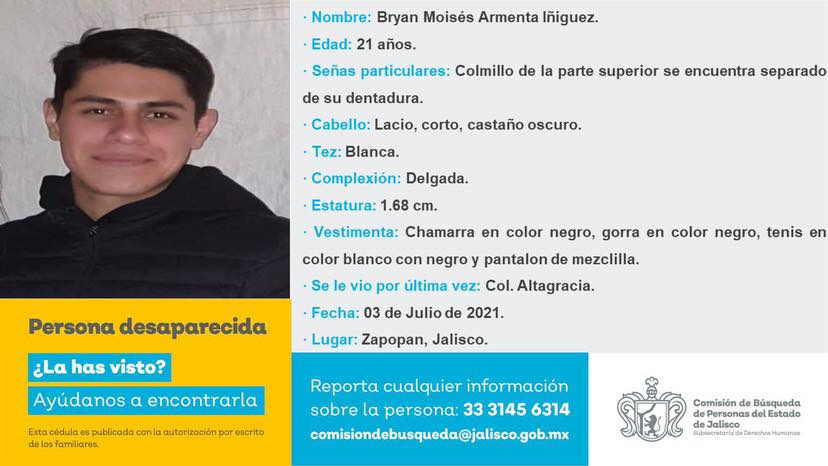 Bryan Moisés Armenta Iñiguez, de 21 años, fue desaparecido el 3 de julio de 2021 luego de haber viajado en un Uber de su casa en la colonia Altagracia, en Zapopan, al Estadio Jalisco en Guadalajara. Mensajes y llamadas recibidas por su familia indican que éste podría haber sido llevado a Aguascalientes o Guanajuato; sin embargo, la Fiscalía Especializada en Personas Desaparecidas no ha hecho nada con esta información, la excusa es que solicitar esas colaboraciones es algo muy tardado.