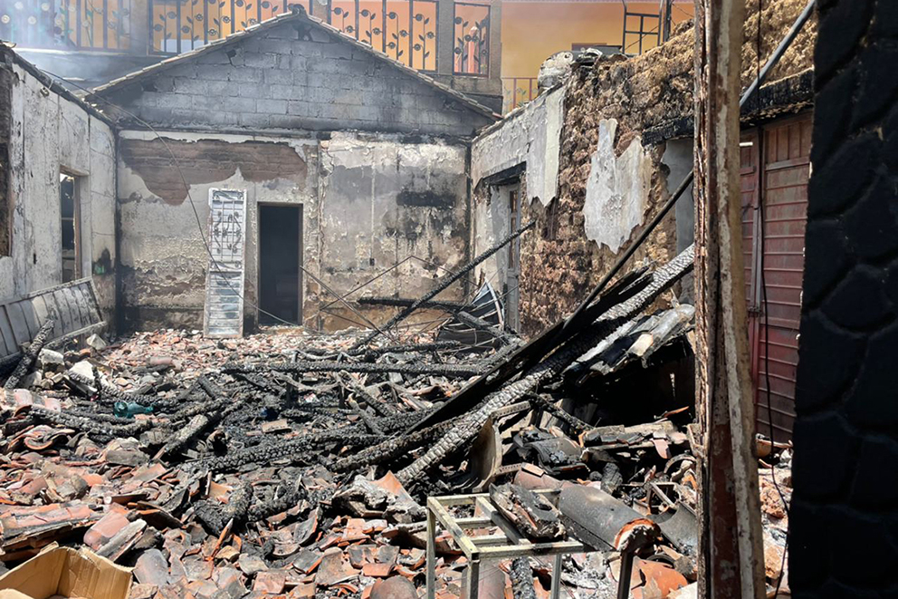 En otra esquina, una vivienda tiene la fachada quemada y en su interior todo incinerado. La vivienda destaca porque, a diferencia de las construcciones alrededor, tiene cámaras de seguridad y cubre con alambre con púas afiladas la parte superior del techo.