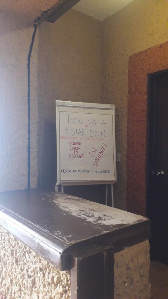 “Todo va a estar bien. Estamos juntos en esto. ¡Sé valiente!”. El pizarrón en el área de recepción manda mensajes de aliento a quienes llegan.
