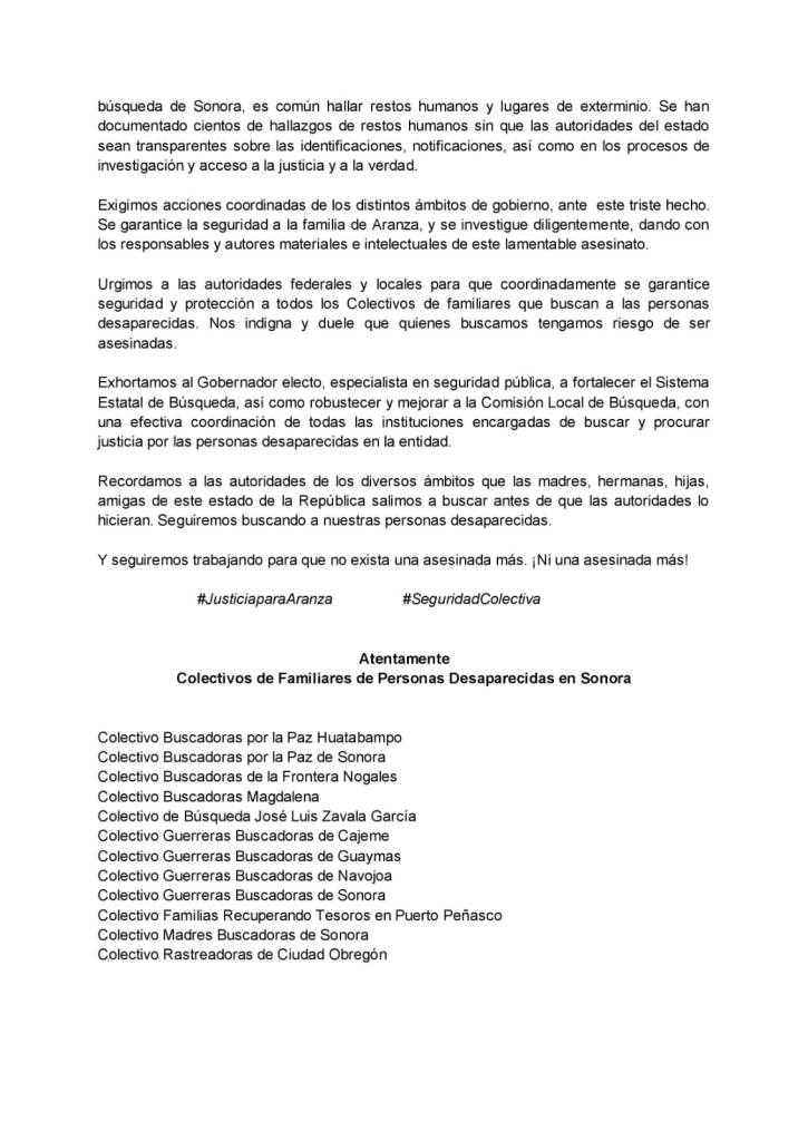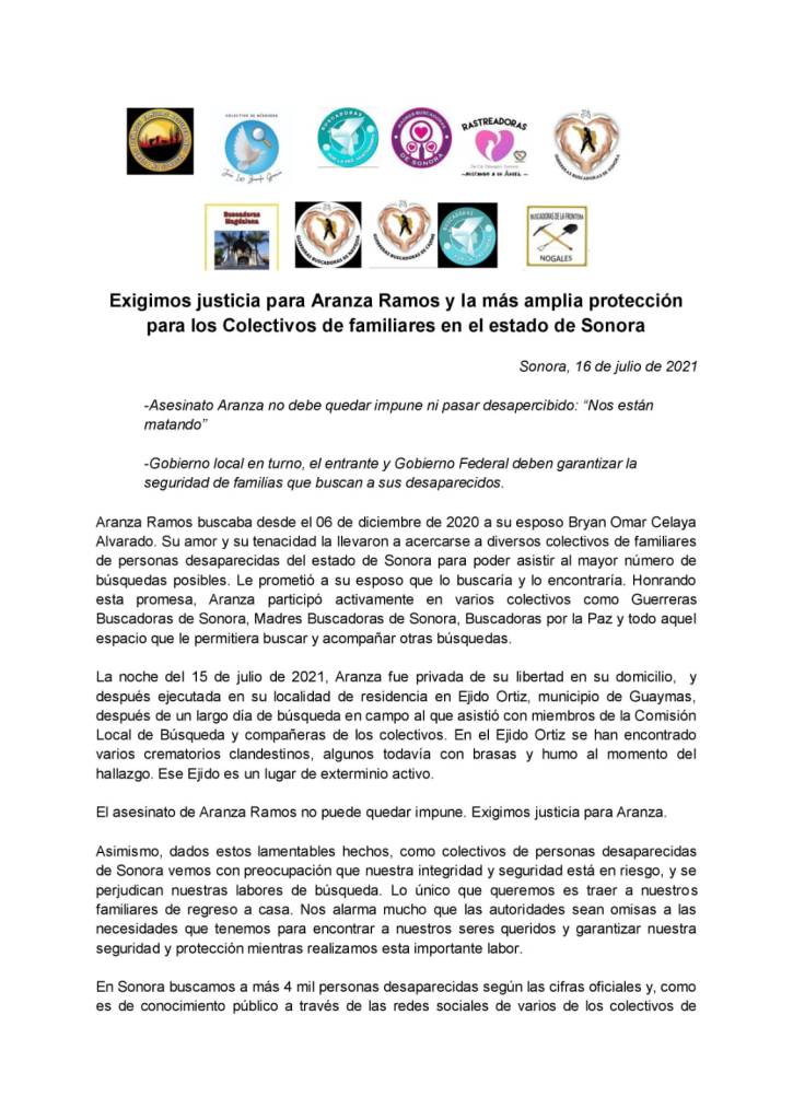 Un día después de participar en una jornada de búsqueda en campo, en la comunidad de Ortiz, en la que integrantes de la Comisión Local de Búsqueda y colectivos localizaron un lugar donde se realizaban asesinatos, Aranza Ramos, integrante del colectivo Madres y Guerreras Buscadoras de Sonora, fue asesinada.