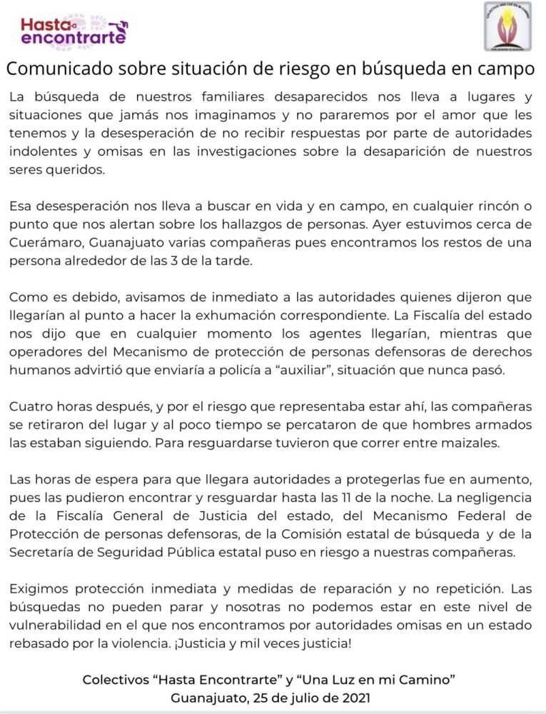 Las amenazas contra personas buscadoras siguen en varias partes del país. Por ejemplo, el 24 de julio, después de una búsqueda en campo en Cuerámaro, Guanajuato, en la que localizaron restos humanos, mujeres integrantes de los colectivos Hasta encontrarte y Una luz en mi camino fueron perseguidas por sujetos armados, lo que las obligó a esconderse entre maizales desde donde escucharon varios disparos.