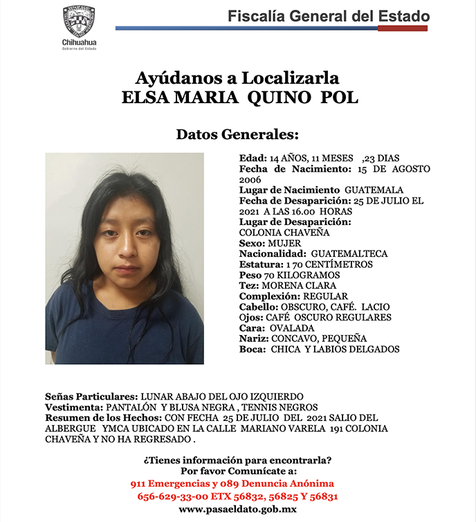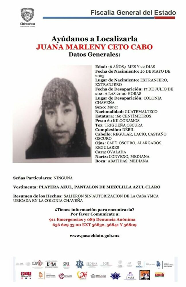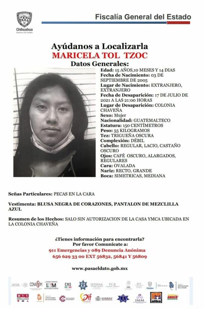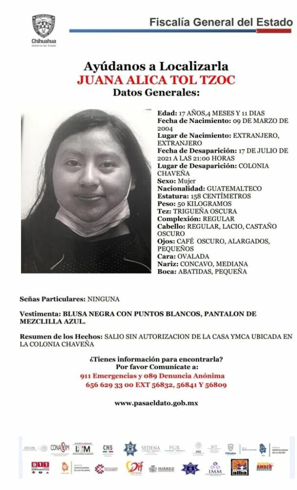 Ese albergue reportó la desaparición de Juana Macario Cocinero, de Guatemala, a quien no se localiza desde el pasado 20 de julio. Las otras adolescentes se encontraban en YMCA, de donde Maricela Tol Tzoc, Juana Marleny Ceto Cabo, Elizabeth Cuin Mejía, Daniela Alejandra Salcido Sierra y Juana Alicia Tol Tzoc desaparecieron el 17 de este mes, mientras que Yajaira del Carmen Dolmos Parrilla y Elsa María Quino Pol, el día 25.