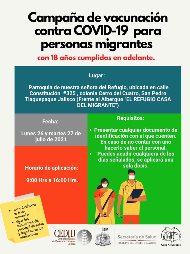 Personas migrantes en tránsito, con o sin documentos mayores de 18 años podrán vacunarse contra la COVID-19. La jornada de vacunación se llevará a cabo los días jueves 5 y viernes 6 de agosto de 2021 a partir de las 9:00 a.m. en la explanada de la Parroquia de Nuestra Señora del Refugio, frente a las instalaciones de El Refugio Casa del Migrante, ubicada en la calle Constitución #325, colonia Cerro del Cuatro en Tlaquepaque Jalisco.
