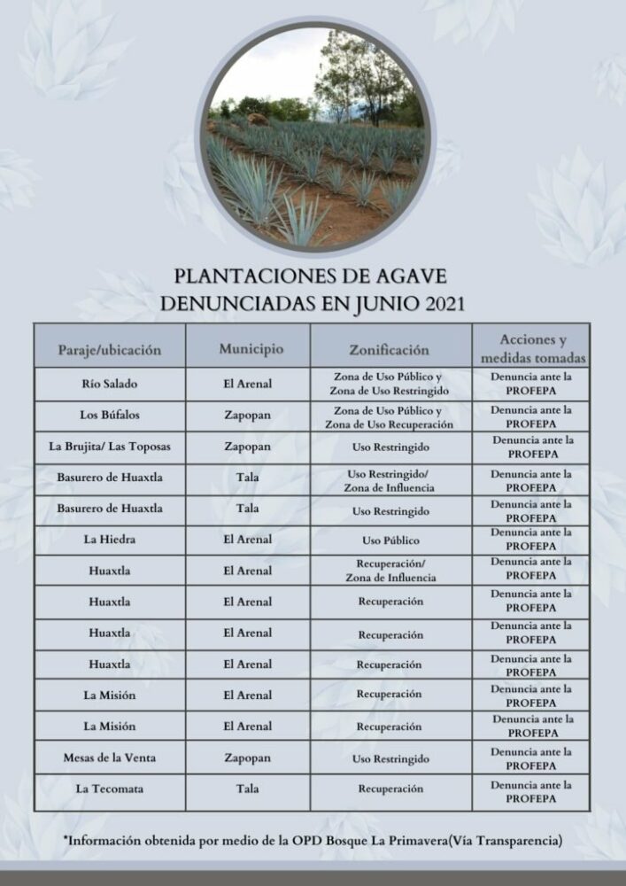 De hecho, según información del Organismo Público Descentralizado (OPD) Bosque La Primavera, existen 16 reportes de plantaciones irregulares dentro del área; de ellas, 15 corresponden al agave, la planta de la que se extrae el destilado que ha dado a Jalisco fama mundial.