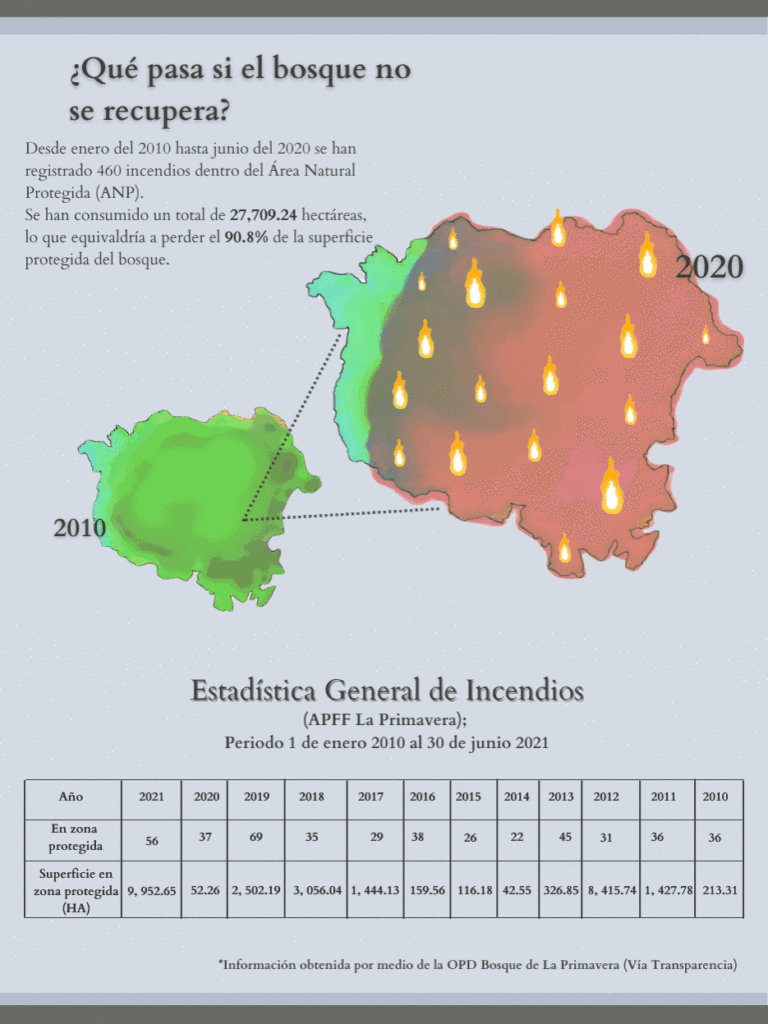 Ese día marcaría un mes negro para el Bosque La Primavera. El incendio en Las Canoas afectó más de 4 mil hectáreas y provocó una alerta atmosférica en Guadalajara y todos los municipios conurbados: Zapopan, Tlaquepaque, Ahualulco, Ameca, Cocula y Tala.