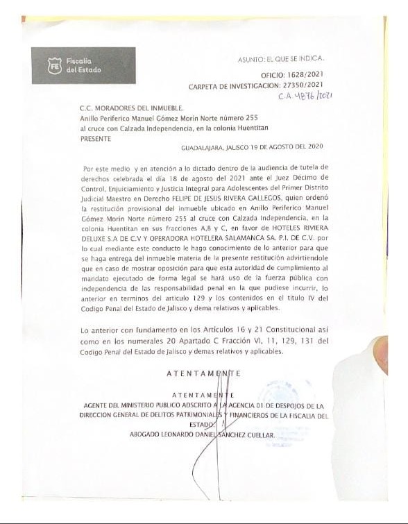 Lugar al que arribaron con uso excesivo de la fuerza integrantes de la Fiscalía del Estado de Jalisco, algunos uniformados y otros de vestidos de civil, para hacer valer, aunque no presentaron una orden formal de desalojo, un mandamiento judicial a favor de “Hoteles Riviera Deluxe y Hotelera Salamanca”, quienes se presentan como los legítimos dueños de un predio que está dentro de un fideicomiso público del Gobierno Municipal de Guadalajara.