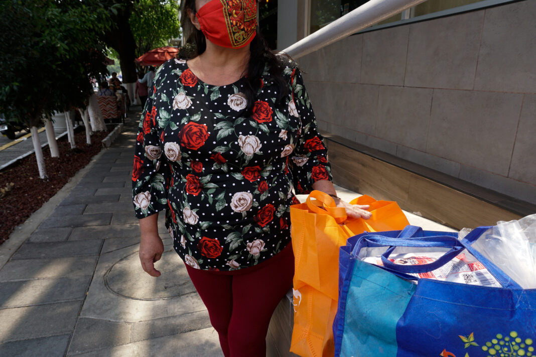 En una calle concurrida del centro de la Ciudad de México, Paty y otras trabajadoras sexuales se reunieron hace poco para recibir despensas por parte de Tejiendo Pueblos. Tranquila y vestida discretamente con “leggings” y una blusa negra con estampado de rosas, Paty cargaba dos bolsas con pasta, galletas, salsas enlatadas, azúcar, sal, frijol, arroz, palomitas de maíz, papel de baño y detergente para ropa.