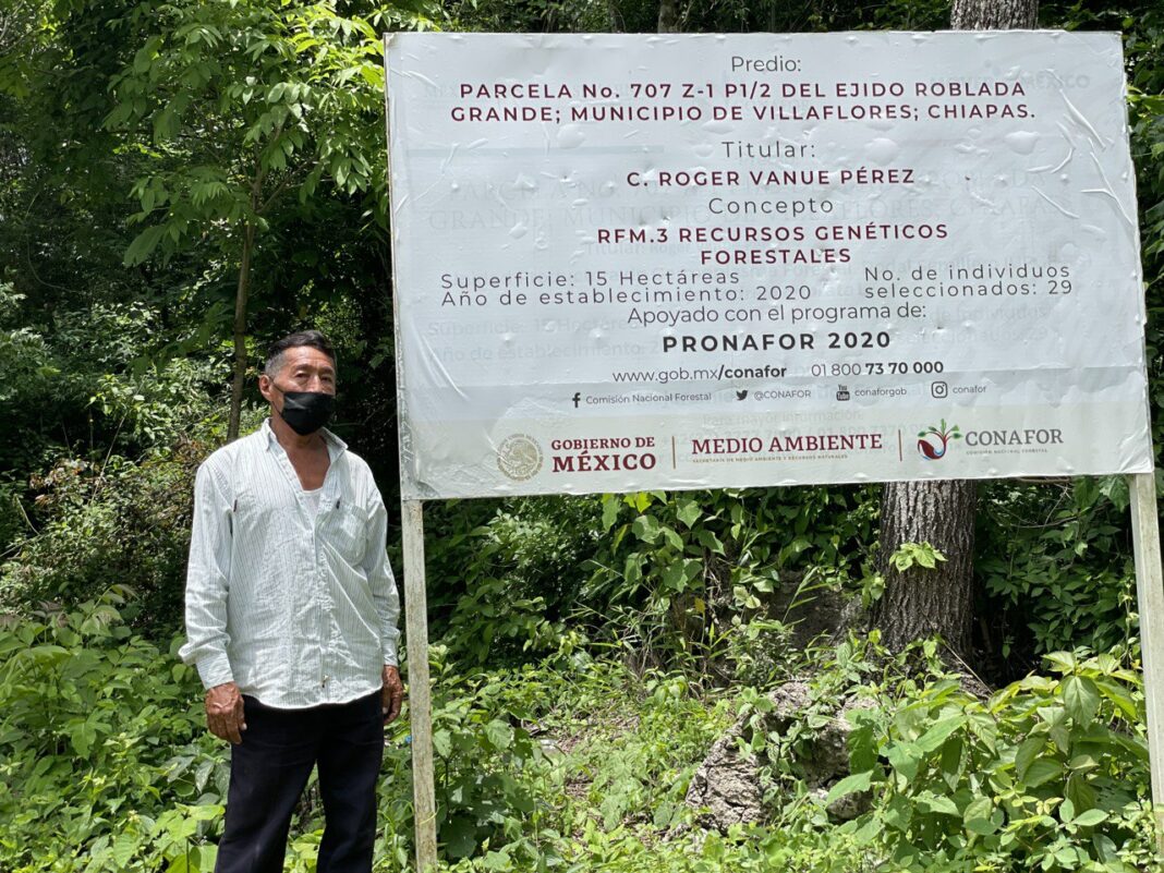 Para llegar a su parcela, debe tomar un transporte que atraviesa un largo camino de terracería. En donde termina el camino, se encuentra su campo de cultivo de árboles. “Parcela 707 Z-1 P1/2 del ejido Roblada Grande municipio Villaflores. Titular: C. Roger Vanué Pérez. Concepto: Recursos Genéticos Forestales. Número de individuos seleccionados: 29. Apoyado con el programa de Programa Apoyos para el Desarrollo Forestal Sustentable 2020 PRONAFOR RFM.3”, señala el letrero que está a la entrada.