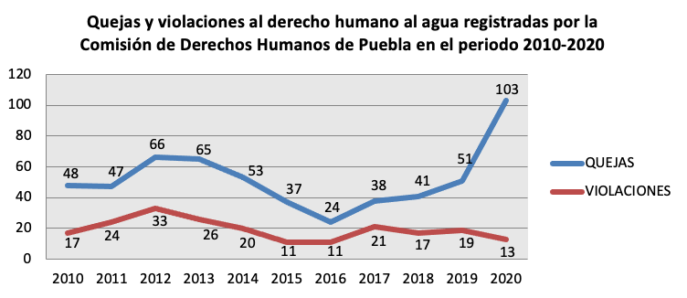Gráfica 1. Número de quejas y violaciones al derecho humano al agua en Puebla (Fuente: Cuauhtémoc Osorno).