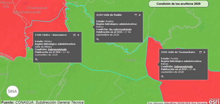 Mapa 1. Área entre el estado de México y Puebla donde se delimitan los acuíferos 2104, 2101 y 1506 (Fuente: CONAGUA).