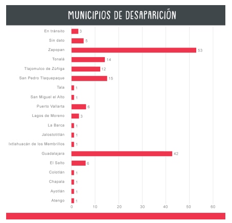 En su mayoría, todas las personas registradas fueron desaparecidas en Jalisco, siendo el Área Metropolitana de Guadalajara, la que concentró el 84.5% de los municipios donde desaparecieron las personas reportadas a Por Amor A Ellxs.
