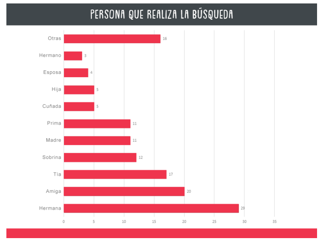 Aunque mayoritariamente hemos observado a las madres encabezar la búsqueda de las y los desaparecidos, Por Amor a Ellxs considero importante saber quiénes más se sumaban a este proceso; en su informe lo que encontraron fue que: “la mayor parte de las atenciones fueron a hermanas, amigas cercanas a la familia y a tías, es decir, el 49.62%”.