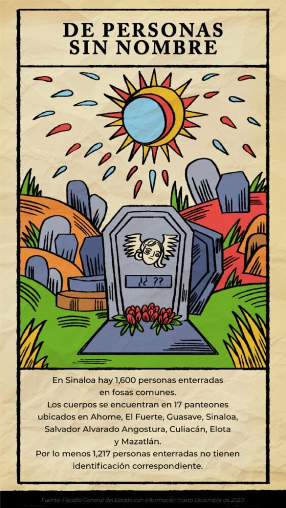 Los cuerpos se encuentran en 17 panteones ubicados en Ahome, El Fuerte, Guasave, Sinaloa, Salvador Alvarado Angostura, Culiacán, Elota y Mazatlán.