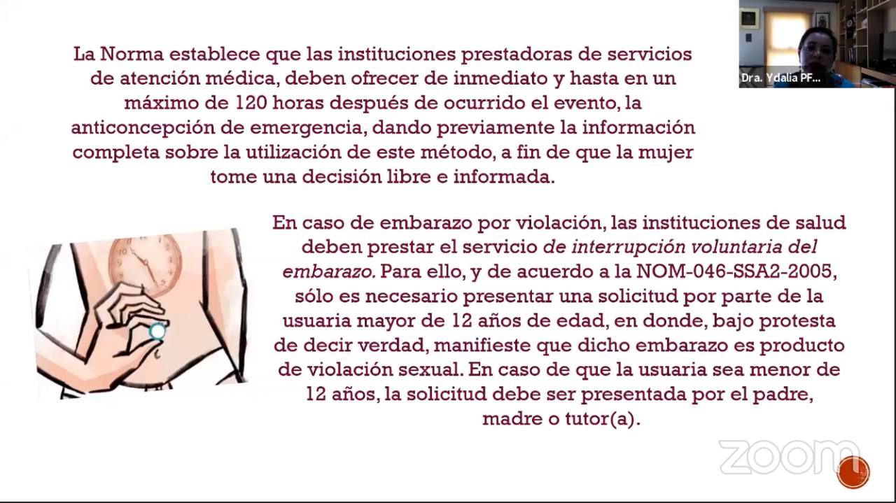En este espacio de diálogo se informó sobre los principios de la NOM-046-SSA2-2005. Violencia familiar, sexual y contra las mujeres, la cual establece que en caso de embarazo por violación o abuso sexual debe garantizarse el derecho a acceder a la interrupción voluntaria del mismo.