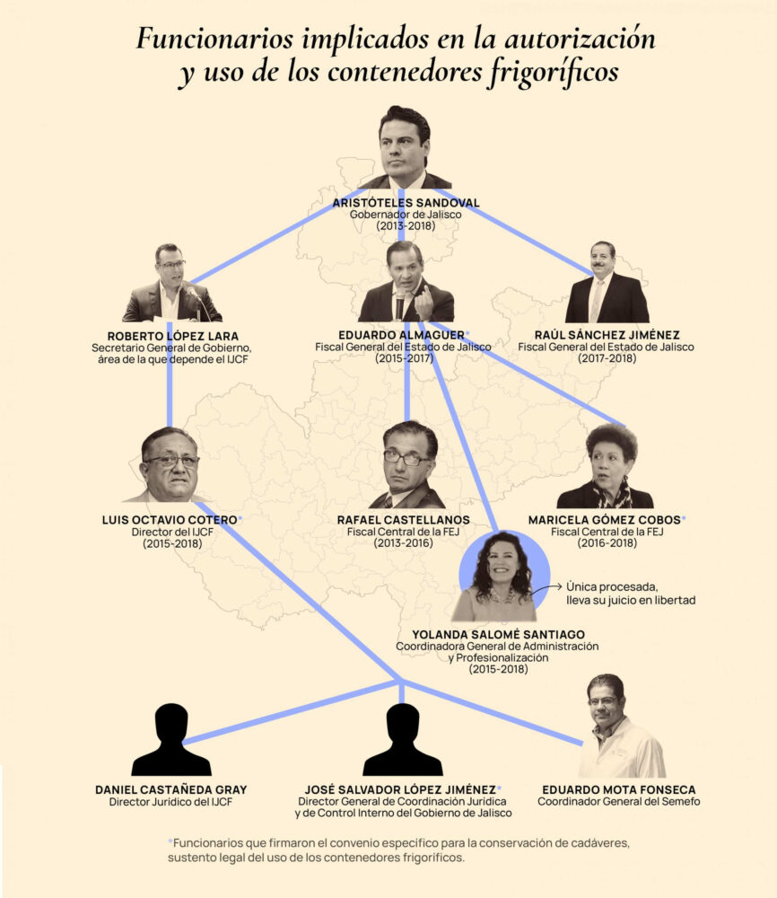 Tampoco existen procesos en contra del ex Fiscal General, Eduardo Almaguer Ramírez y José Salvador López Jiménez, ex director general de Coordinación Jurídica y de Control Interno del Gobierno de Jalisco, quienes firmaron el Convenio que oficializó el uso de los contenedores. Ni existe nada contra el ex Secretario de Gobierno, Roberto López Lara, quien en todo momento supo de la decisión, pues el propio Cotero Bernal enviaba informes diarios de la saturación tanto del SEMEFO como del primer contenedor.
