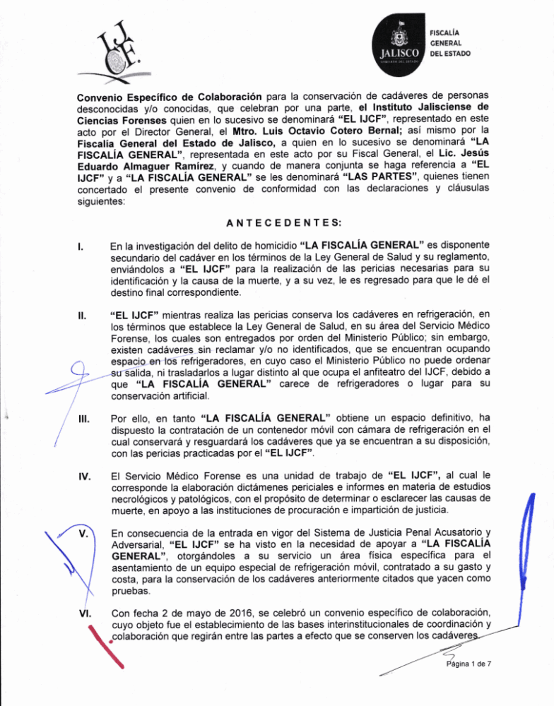 Quienes firmaron el denominado el “Convenio específico de colaboración para la conservación de cadáveres” fueron el ex Fiscal General, Eduardo Almaguer Ramírez (hoy regidor); la ex Fiscal Central, Maricela Gómez Cobos; el ex director del IJCF, Luis Octavio Cotero Bernal (hoy vinculado a proceso); y José Salvador López Jiménez, ex director general de Coordinación Jurídica y de Control Interno del Gobierno de Jalisco.