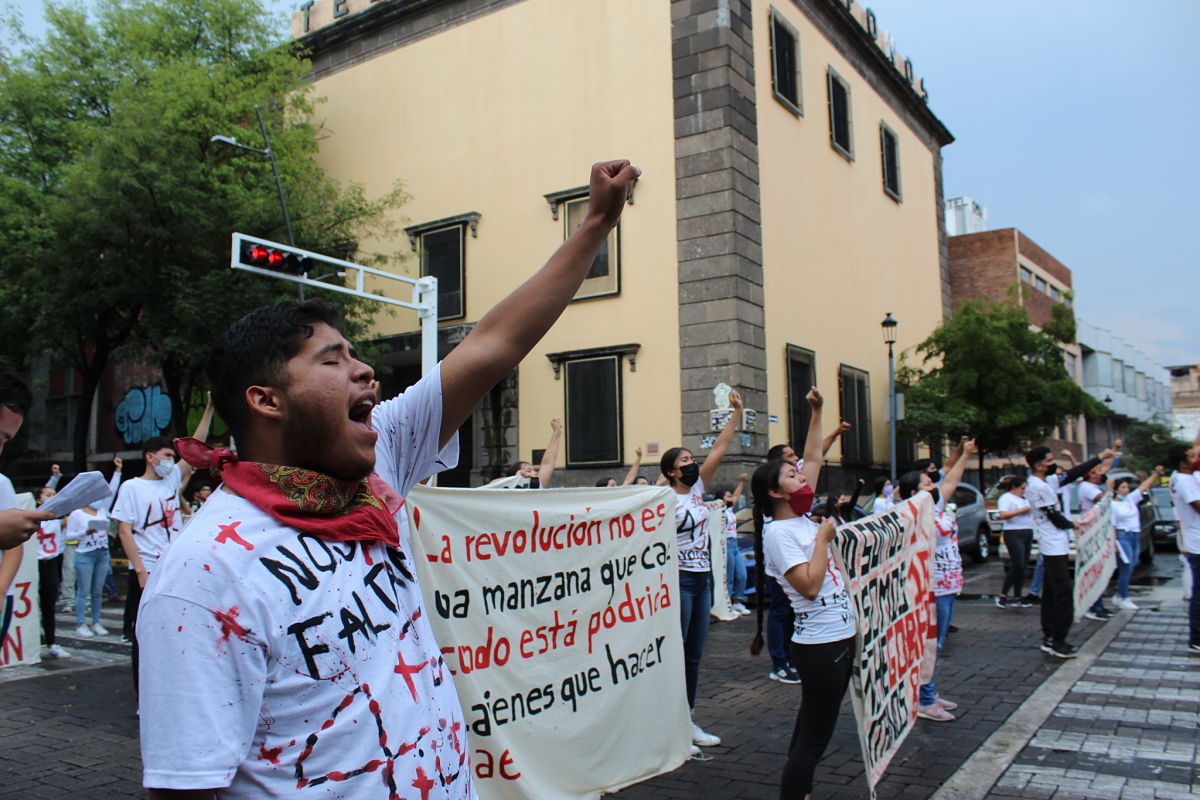 Sin protección de vialidad y con resistencia de la policía, más de 200 estudiantes de la Escuela Normal Rural “Miguel Hidalgo” de Atequiza, Jalisco, y el colectivo Ayotzinapa Somos Todos y la Asamblea Popular y Solidaria de Jalisco marcharon por las calles de Guadalajara para recordar que hace 7 años sus compañeros fueron víctimas de desaparición forzada cometida por policías municipales de Iguala y Cocula, Guerrero.