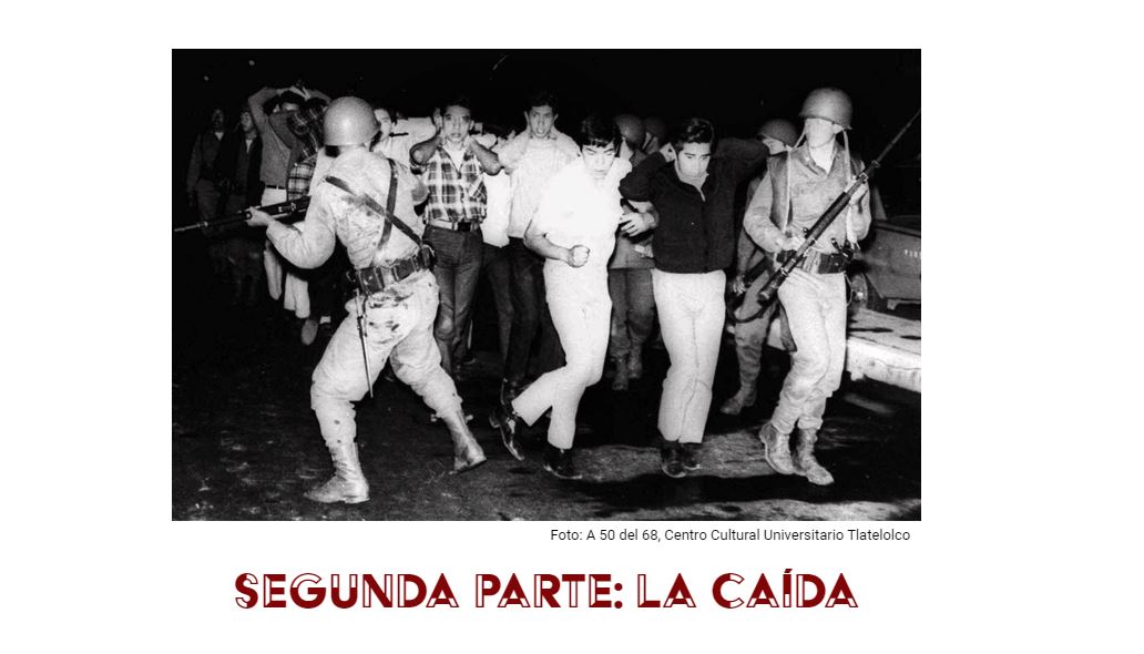 Aproximadamente a las 6:10 de la tarde comenzó la masacre del 2 de octubre. Carlos escuchó la noticia en el radio. Ahí se hablaba de un franco tiroteo en contra los policías de parte de los estudiantes que estaban en la Plaza de las Tres Culturas en Tlatelolco; entre 15 y 25 personas murieron ahí. Tita, por su parte, leyó a la mañana siguiente en un periódico una pequeña nota que hablaba de un enfrentamiento entre estudiantes y autoridades: “Las personas creían que el mismo 3 de octubre el pueblo se levantaría en armas, pero eso no fue lo que sucedió”, precisó.