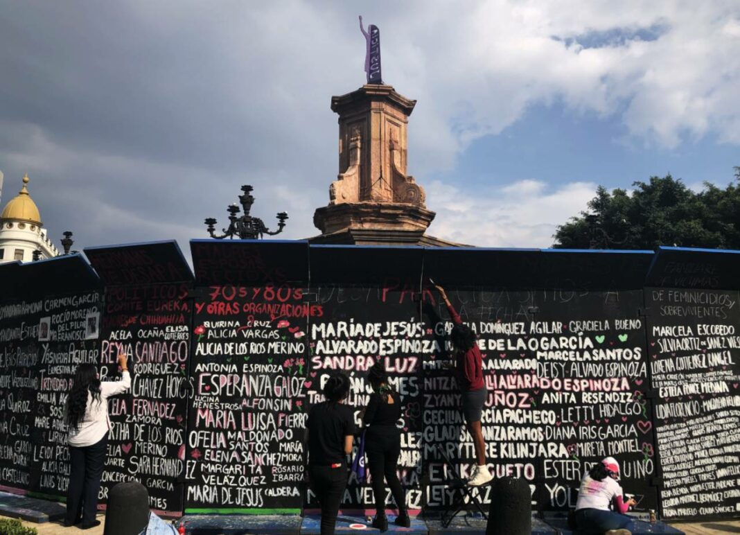 Mujeres activistas, principalmente madres de víctimas de feminicidio o desaparición, volvieron a escribir los nombres de sus familiares que el gobierno de la Ciudad de México borró en las vallas que rodean la antimonumenta, donde antes estaba la escultura de Cristóbal Colón