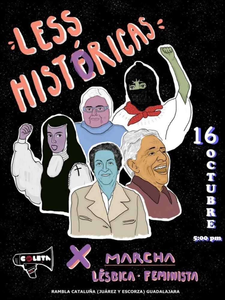 “Coleta-Colectivo Lésbico Tapatío’’ invita a todas las mujeres lesbianas a asistir y formar parte de la marcha lésbica feminista ‘’LessHistóricas’’. La cita es el próximo 16 de octubre a las 5:00pm en el centro de Guadalajara, Jalisco.