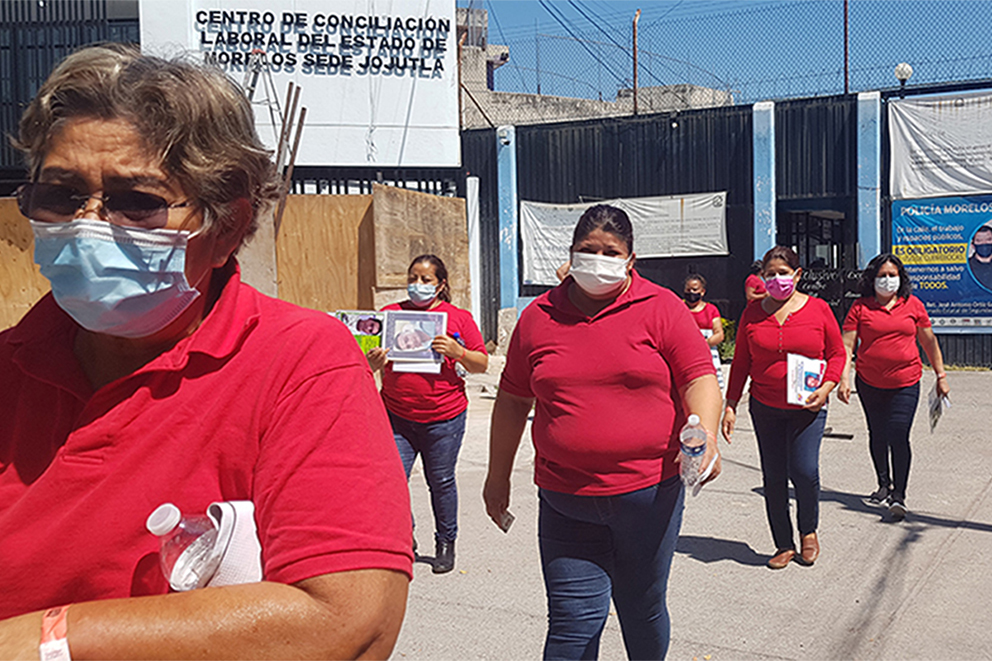 Afuera del auditorio, mientras esperan, sobresalía del grupo una mujer de sombrero rosa, que llevaba un paliacate del mismo color amarrado al cuello, mientras portaba un cubrebocas morado.