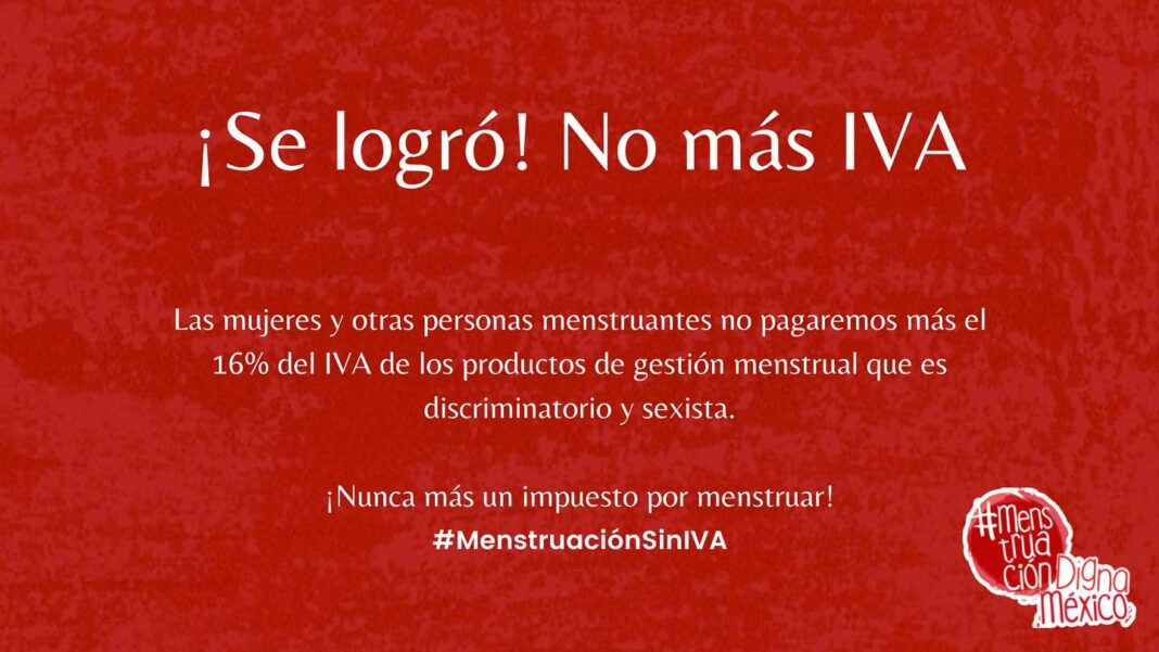 A pesar de que la lucha fue larga, el pasado 21 de octubre la Cámara de Diputados aprobó eliminar el IVA, posteriormente, el día 27 el Senado de la República aprobó en el Paquete Económico 2022 la eliminación del Impuesto al Valor Agregado (IVA) a los productos para la higiene menstrual. Así, estos pasarán de tener tasa del 16% al 0% el 1 de enero del 2022.