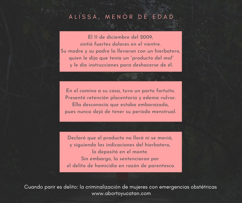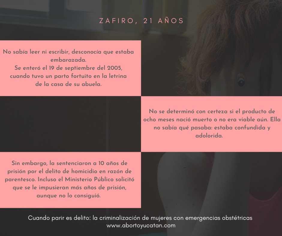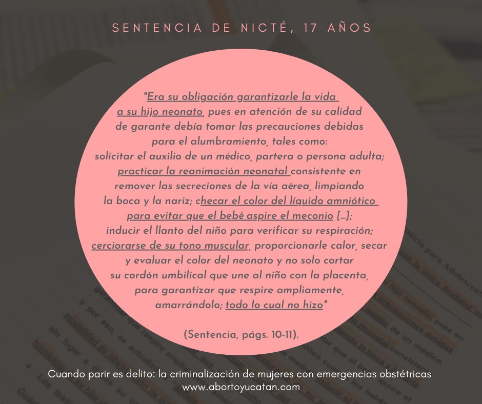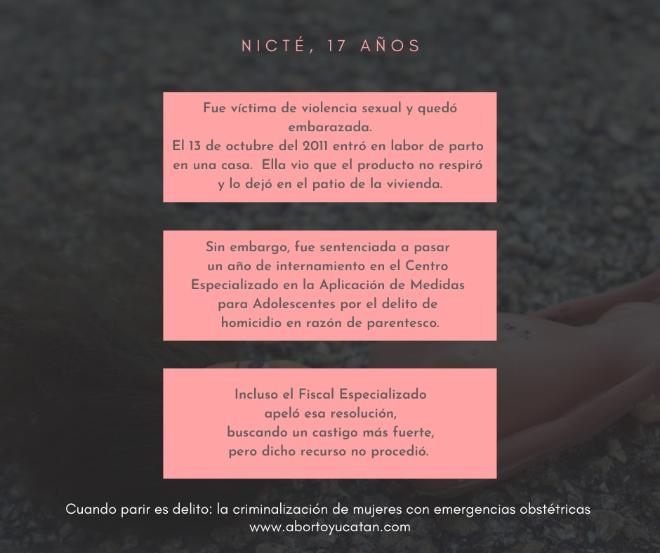 Nicté*, una menor de edad originaria de Tahdziú, tuvo un parto fortuito a los siete meses de gestación, en un embarazo producto de violencia sexual. Nunca llevó control prenatal. Al acusarla, el Fiscal argumentó que “dejó de actuar aunque tenía el deber legal de hacerlo” y “no solicitó ayuda para el parto”.
