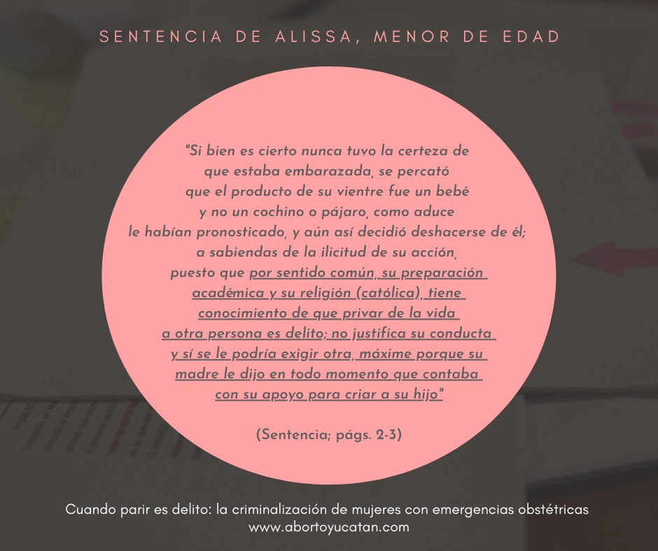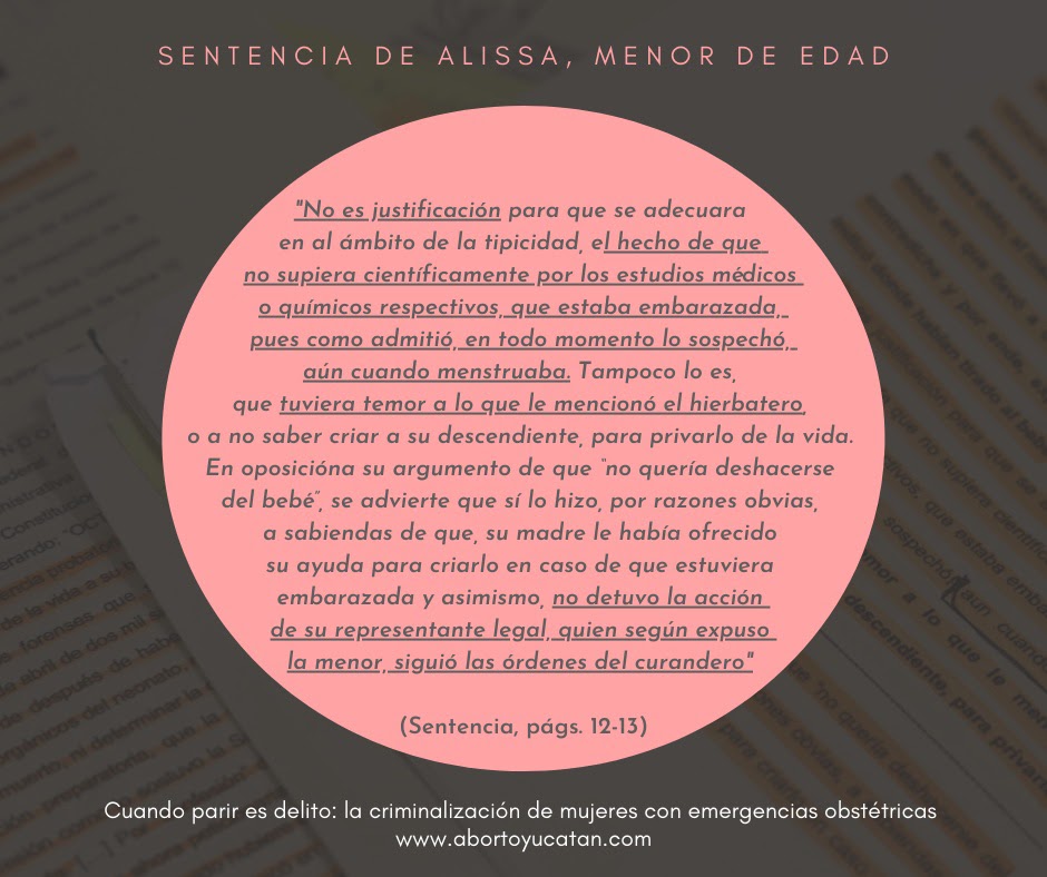 En las sentencias también queda clara la intención de los fiscales de culpabilizar a la mujer por no asistir al producto durante la emergencia obstétrica. La maestra en antropología social, Roxana Aguilar Ramírez concluyó en una investigación focalizada en Yucatán que lo que toman en cuenta es “el manejo de los restos fetales de su propio embarazo que es interpretado como la decisión de hacer morir a sus hijos”.