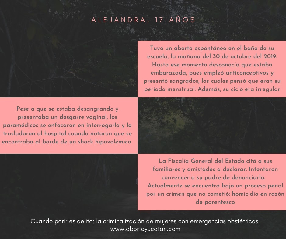 Alejandra es una de las ocho casos de mujeres que fueron acusadas de homicidio en razón de parentesco por una emergencia obstétrica, es decir, tras tener un aborto espontáneo o parto fortuito en Yucatán entre el 2005 y el 2021.