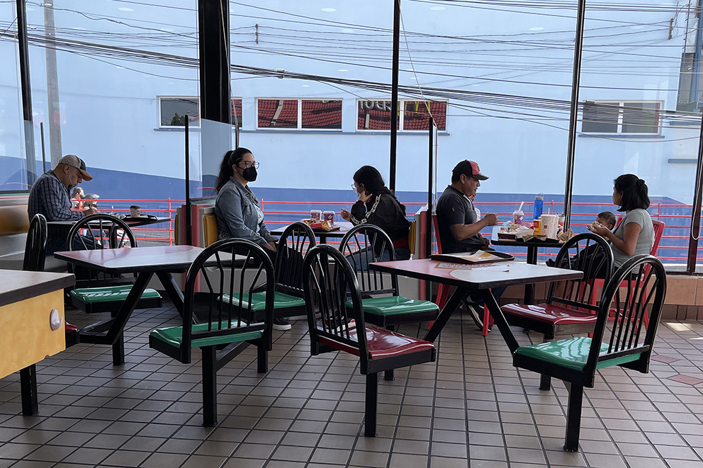Un hombre de unos 60 años, solo en una mesa, come hamburguesa con papas y refresco. Una joven abuela carga a un recién nacido, la madre no tiene más de 20 años. Sale una embarazada tomando un vaso gigantesco de refresco. Si hay niños, en sus mesas hay cajitas felices, pero los adultos que les acompañan -padres, abuelos, tíos- sólo piden papas, refresco, un café. Aquí los clientes son personas de clase trabajadora, popular. Consumen poco, por eso el corporativo no invierte en remodelar, me explica la informante.