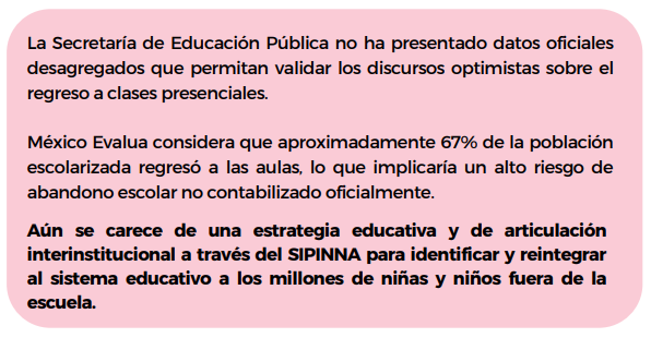 México Evalúa, estimó que aproximadamente el 67% de la población escolarizada regresó a las aulas, esto implica un alto riesgo de abandono escolar no contabilizado oficialmente.