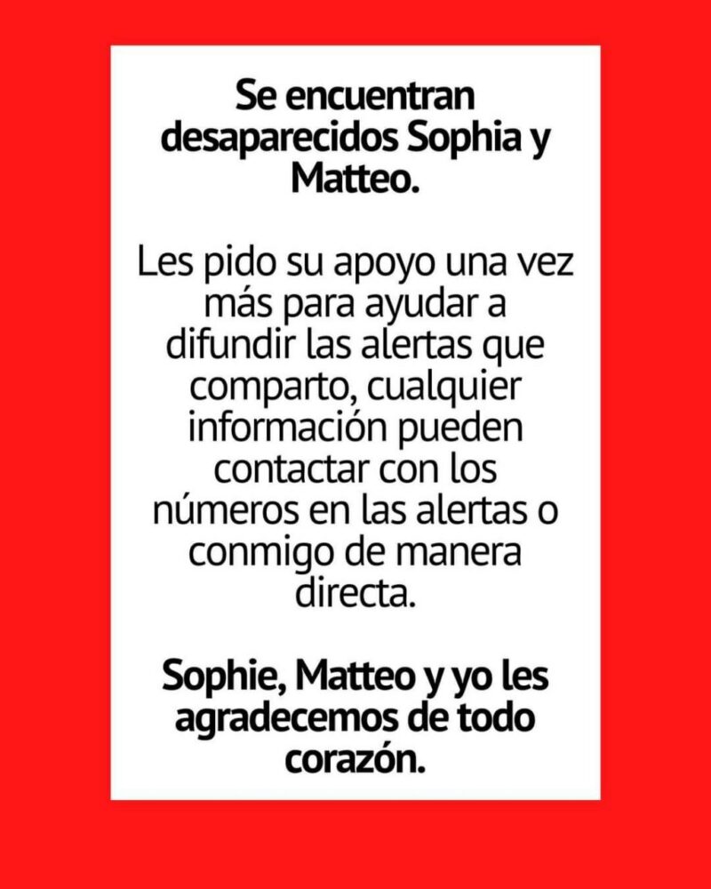Finalmente, entre lágrimas envió mensaje a Sophia y Matteo y pidió el apoyo de todas y todos para poder recuperarlos: