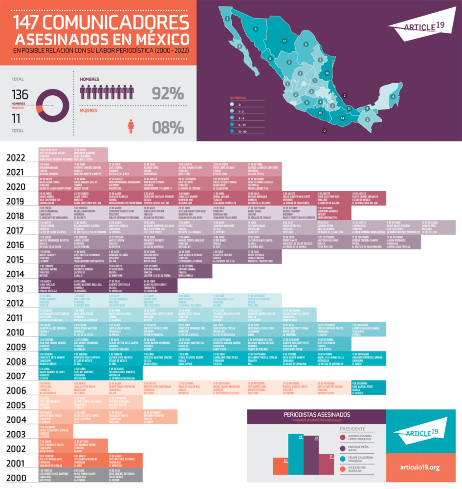 Del 2000 a la fecha han sido asesinados 148 periodistas en el país.