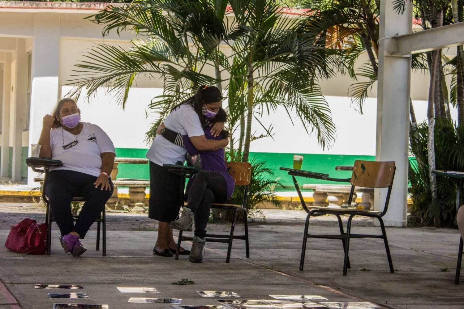 Los reos y las reas apenas se acercan a mirar las fotografías y las lonas que se colocaron en el suelo. Pasan rápido, en grupos pequeños. Las mamás usan un micrófono y una bocina que no sirve; piden que si alguien tiene información sobre alguno de los desaparecidos, la comparta.