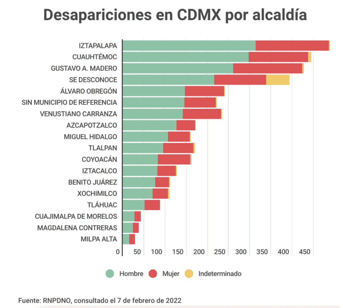 La Ciudad de México no es un territorio que se libre de la crisis de desaparición que se vive en varias regiones del país. Hasta la primera semana de febrero, 3 mil 665 personas están reportadas como desaparecidas o no localizadas; en todas las alcaldías de la metrópoli hay casos. La mayoría de estos reportes se presentaron en los últimos tres años. Como en otros lugares, las familias son las que investigan y buscan.