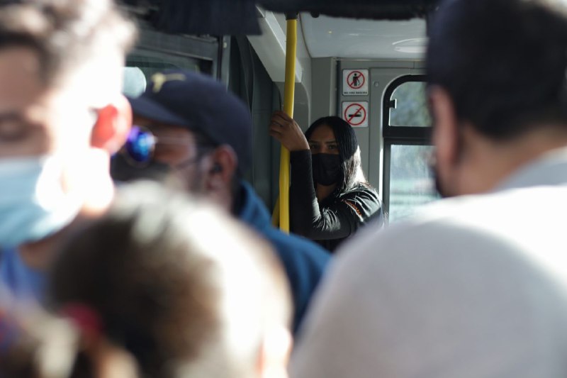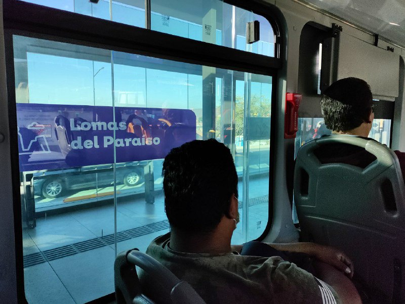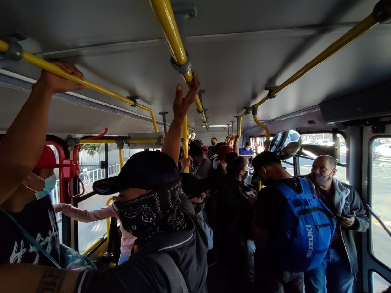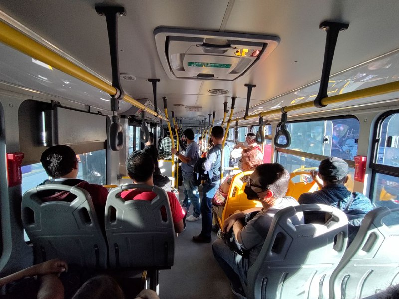 Quienes no alcanzan un lugar, se agarran de donde puedan. Dentro una pantalla indica al chofer la visibilidad de varias cámaras internas en la unidad y unas pequeñas bocinas ambientan el lugar con canciones populares (en el recorrido se escuchó “Cruz de Navajas” de Mecano).