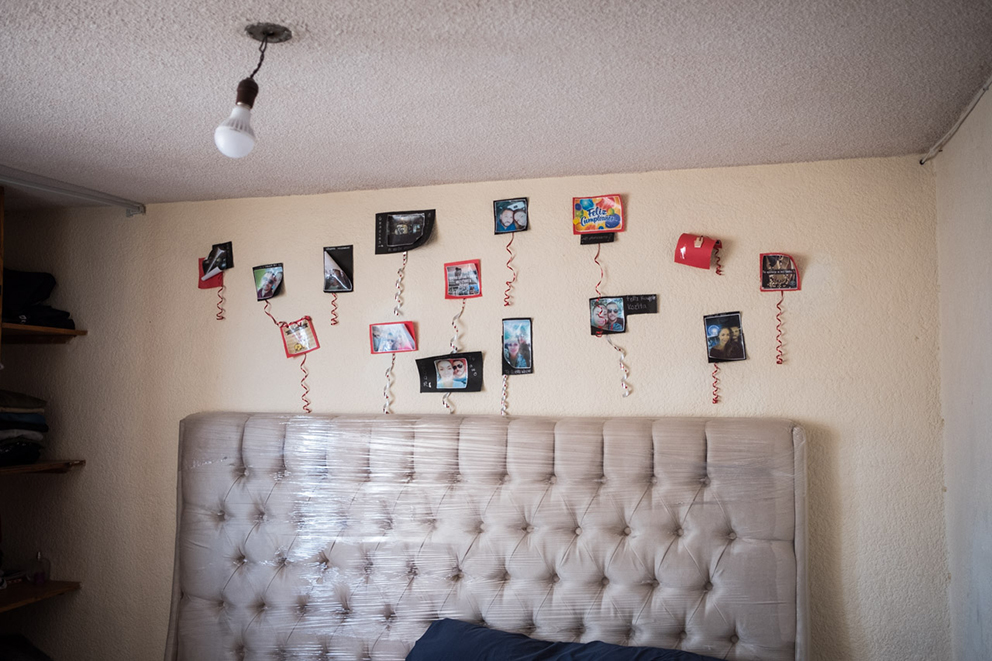 Imágenes de Pedro Carrizales alias El Mijis junto a su familia cuelgan en la pared de una de sus habitaciones. San Luis Potosí, SLP. México. Agosto 21, 2018. Mauricio Palos.