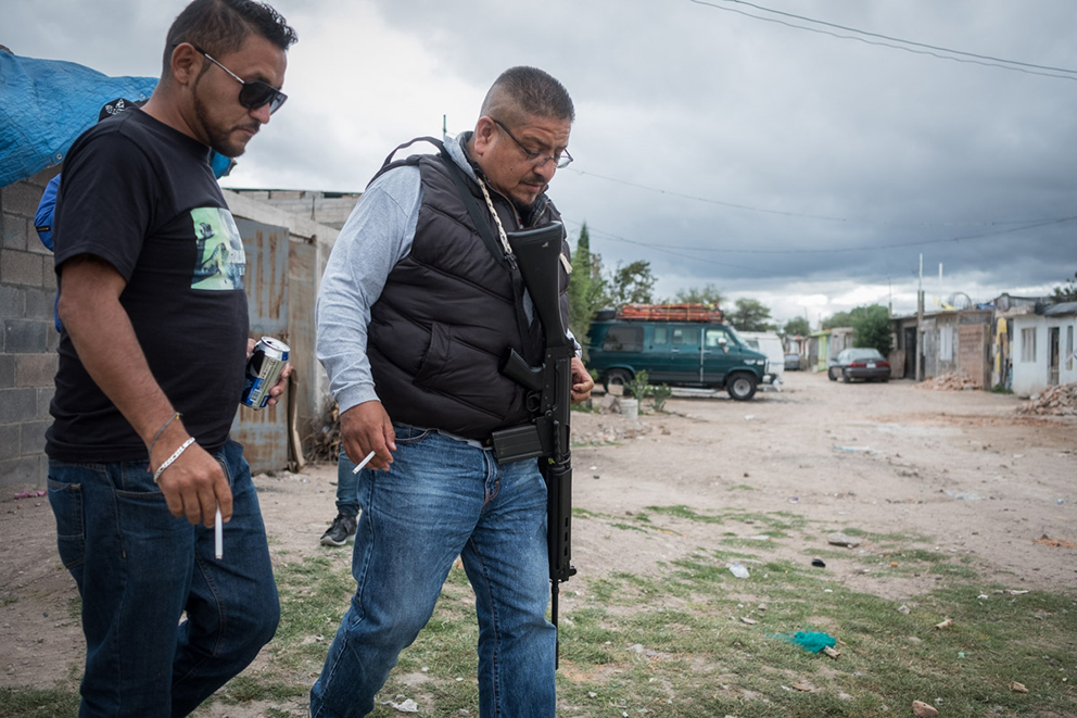 Miguel Angel Zuñiga, escolta y tío de Pedro Carrizales aka El Mijis sostiene una pistola de madera junto a su sobrino Pedro Carrizales y Marco Antonio Alvarez Briseño, uno de los expandilleros ayudados por el Mijis. San Luis Potosí, SLP. México. Agosto 21, 2018. Mauricio Palos.
