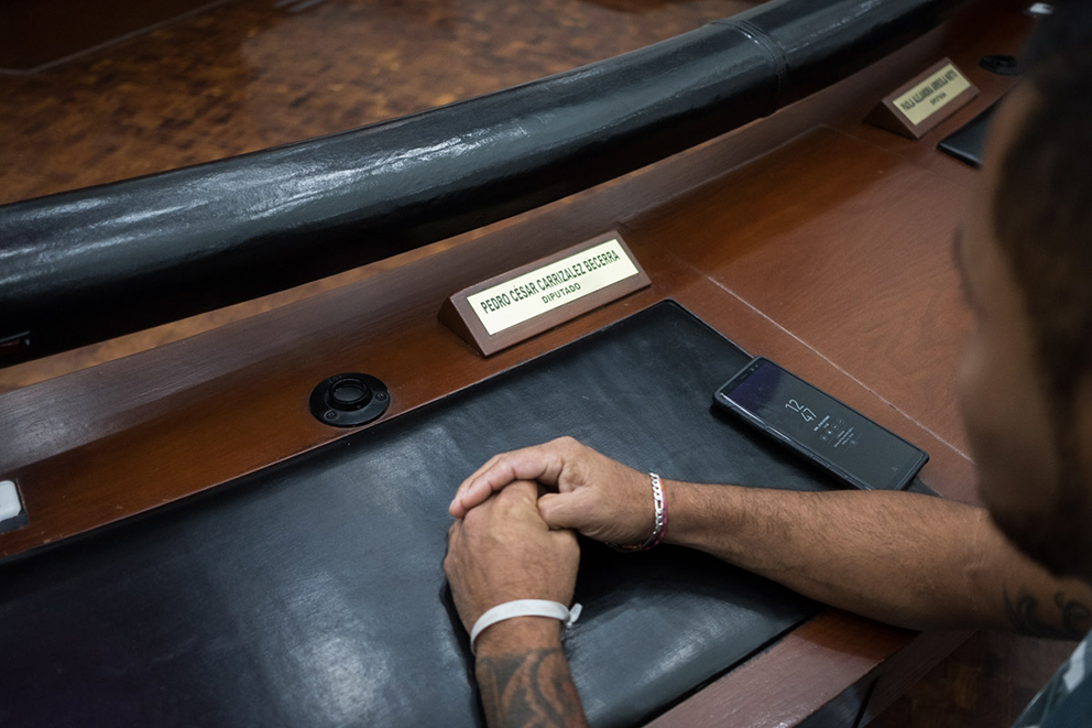 El Mijis, en sus primeros meses como diputado local, posa para un retrato en su asiento frente al Salón de Plenos Ponciano Arriaga Leija en el Congreso de San Luis Potosí, SLP. México. Octubre 23, 2018. Mauricio Palos.