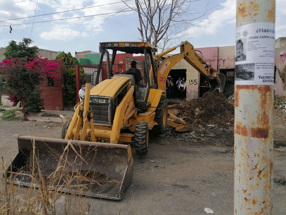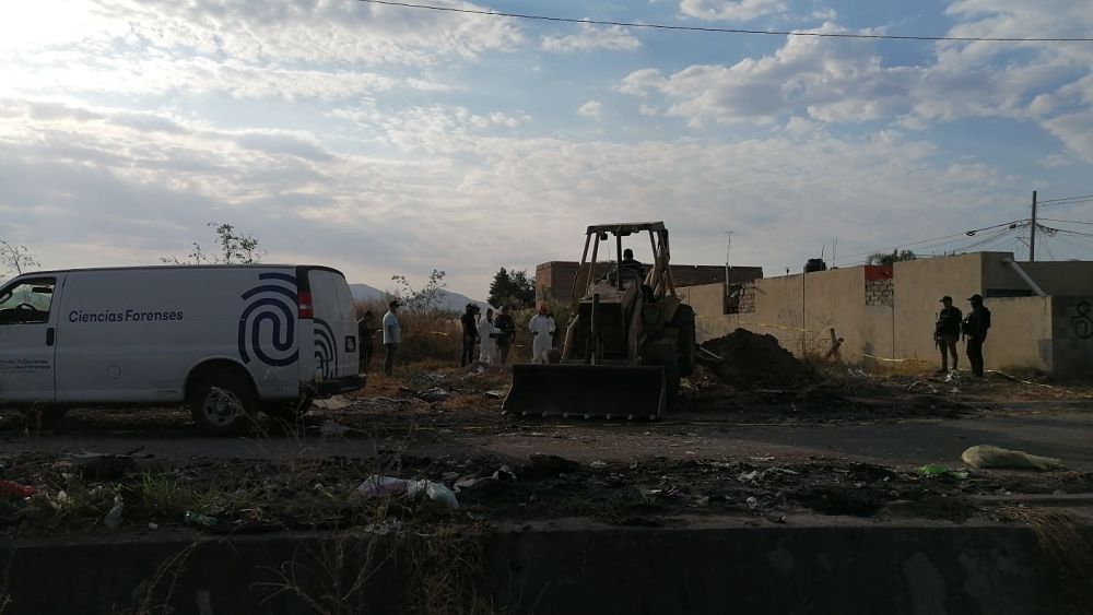 Después de quitar telas y basura con sus manos en una de esas casas, las madres solicitan maquinaria al presidente de Tlajomulco de Zúñiga para acelerar el proceso. Un par de horas después, envían una retroexcavadora y un camión de volteo desde la presidencia. La máquina hace hoyos y luego las mujeres verifican si se ven bolsas de plástico o cualquier indicio de restos humanos.