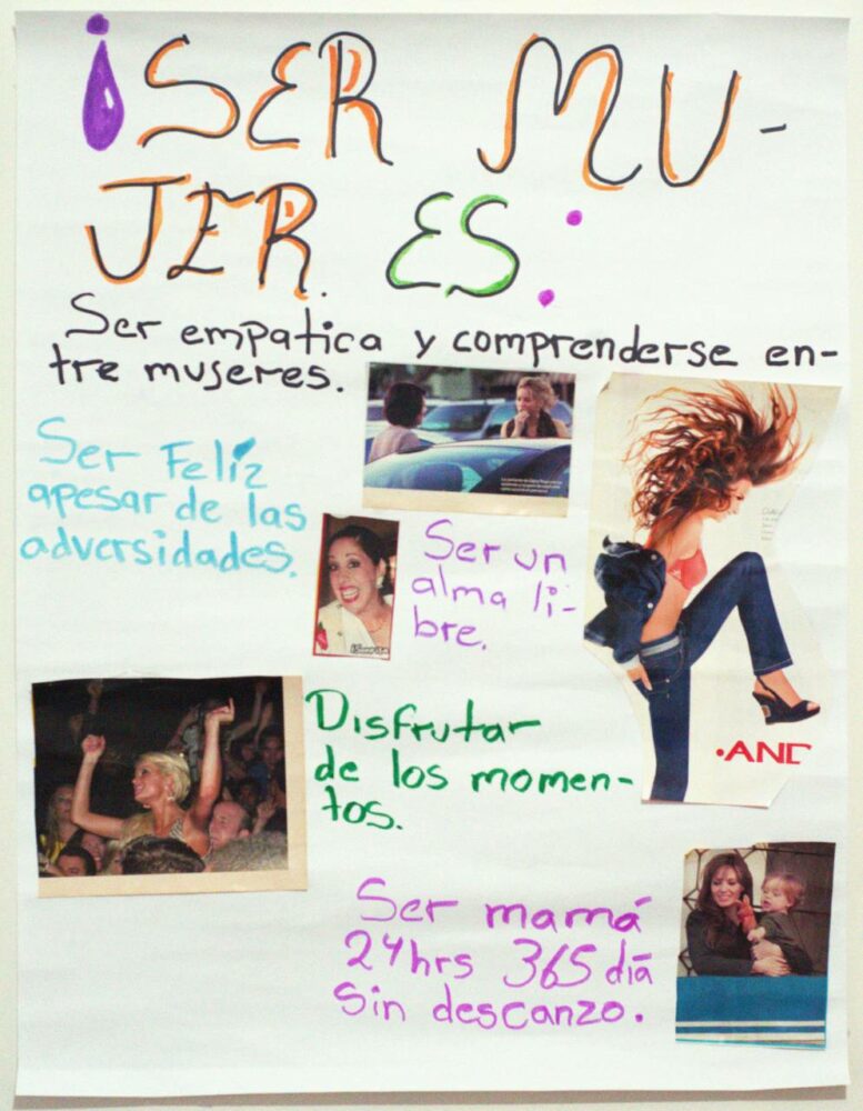 Mujeres cis y trans -integrantes de las comunidades de Brigada Callejera, AMETS y La Casa Hogar Paola Buenrostro- hicieron el ejercicio de responder tres preguntas –¿Qué significa para ti ser mujer?, ¿de quién aprendiste a ser mujer?, ¿cómo impacta ser mujer en tu trabajo?– a través de un collage de imágenes que sacaron de revistas o de internet.