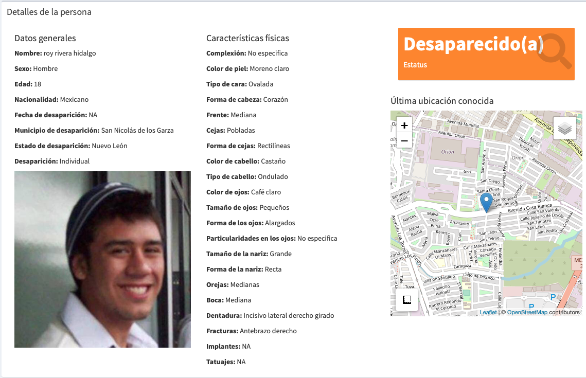 En la plataforma se pueden realizar búsquedas de personas desaparecidas ofreciendo información muy puntal de cada víctima y del lugar de donde se le desapareció.