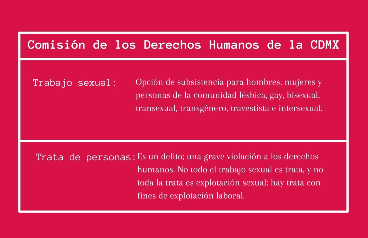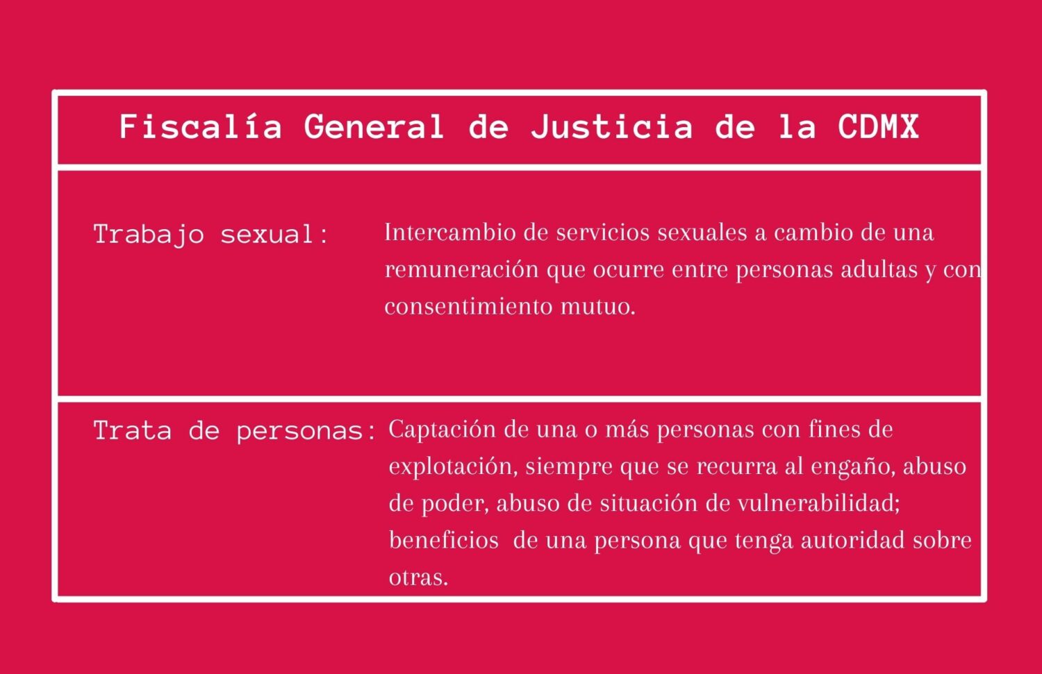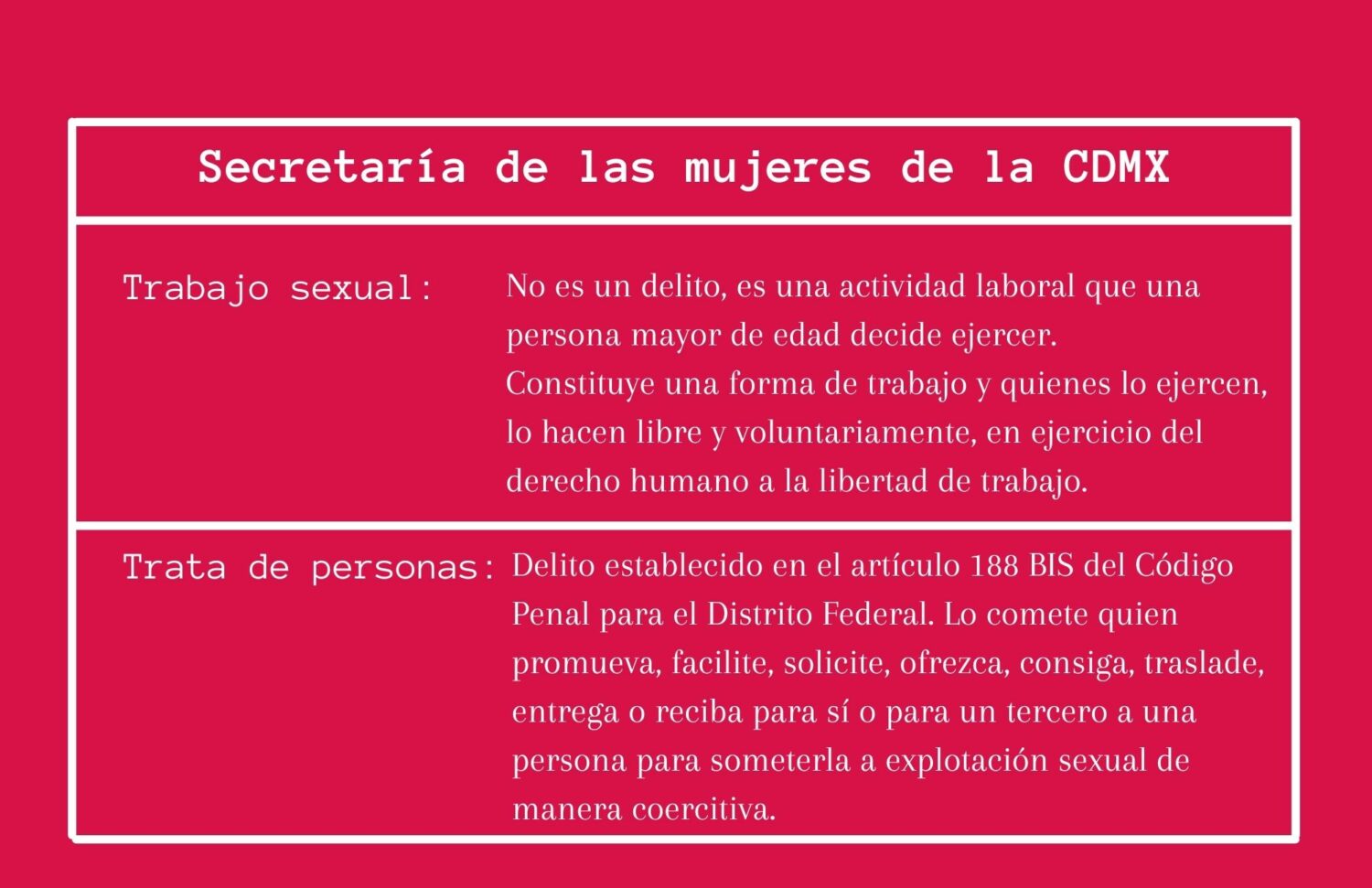 En la Ciudad de México han habido muchísimas modificaciones de leyes y de reglamentos respecto al trabajo sexual. Ha habido épocas donde fue muy criminalizado. Lo puedes leer en el Fulgor de la Nochede Marta Lamas. Ahorita estamos en una de las épocas de mayor reconocimiento del trabajo sexual y diferenciación de la trata. Pero, ¿qué pasa en los procesos legales?”.