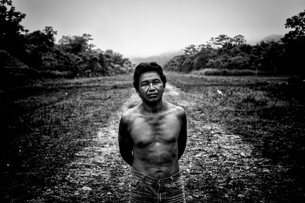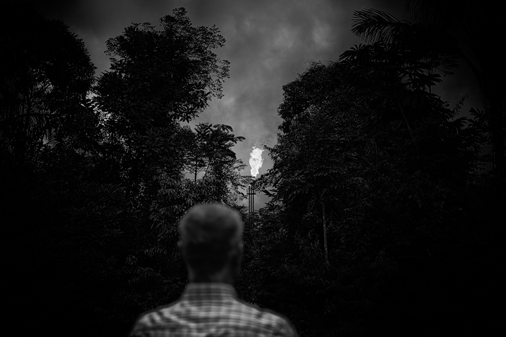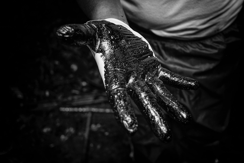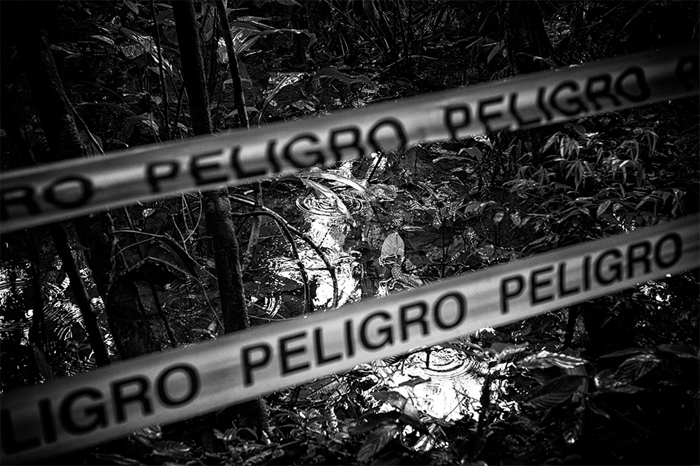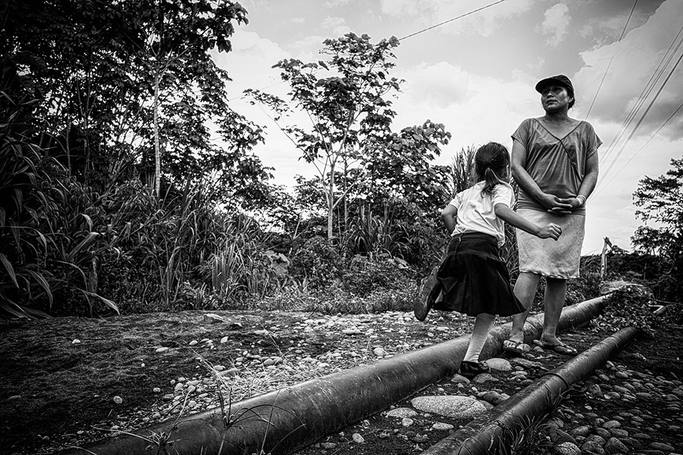 Evidencia de contaminación de petróleo en el terreno cercano al pozo Aguarico-04 (AG-04) Nueva Loja, Provincia de Sucumbíos. El pozo fue abandonado hace varios años y alrededor del lugar hay contaminación tanto en la superficie como en el subsuelo.La familia Z, reunida en un cuarto de la casa en la periferia de El Coca, Provincia de Orellana. La Señora Alexandra recibe 100 dólares mensuales como indemnización por parte del gobierno. De sus tres hijos, dos padecen de hidrocefalia y el Señor Pedro, cáncer. Damián, de 5 años, sufre de hidrocefalia y discapacidad cerebral del 82% , y Liliana de 15 años, tiene discapacidad del 75 por ciento.Vista aérea de la selva amazónica, Poblado de Shell – Comunidad de Llanchama Cocha en el territorio Sápara. El río Conambo no es navegable y su único medio de transporte es a pie o en avioneta. Este territorio es rico en petróleo y por esto desde hace años está amenazado por las concesiones petroleras que el gobierno ecuatoriano otorga a empresas extranjeras. Hoy se cuentan solo 573 miembros Sápara en un territorio aproximado de 401 millones 6 mil 103 hectáreas que cuidan y controlan en contra de la explotación petrolera; la cual amenazaría su futuro y la integridad de la selva.Génesis de 5 años corre entre las tuberías de petróleo semienterradas que cruzan la entrada de su casa en la periferia de El Coca, Provincia de Orellana. Mónica, su madre, tiene cáncer.Una lancha viaja por el Río Bobonaza, en las cercanías de la comunidad de Sarayaku, provincia de Pastaza, al interior de la selva amazónica. El Río Bobonaza es el único acceso por tierra para ingresar a la zona. El camino para llegar ahí es complicado, con aproximadamente 50 kilómetros de sendero desde Puyo, donde circulan algunas camionetas 4×4. El pueblo originario de Sarayaku, siempre se ha opuesto a la construcción de una carretera terrestre, esto para evitar la deforestación y así poder mantener el control de su territorio al que llegan intrusos de empresas petroleras y militares.Vista aérea del poblado de Shell, en la provincia de Pastaza. Este poblado adoptó el nombre Shell, por la primera empresa petrolera holandesa que llegó a Ecuador en 1937. Antes de la llegada de la empresa, el sitio era conocido por la presencia y cacería de puercos saínos. Este lugar tiene 8000 habitantes y el aeropuerto “Río Amazonas” cuenta con 12 aerolíneas de avionetas para los ingresos a la zona Amazónica Ecuatoriana.Don Luis no camina desde hace un año. Padece una enfermedad que desconoce y no tiene un diagnóstico oficial. Los médicos locales conjeturan que tiene cáncer de colon y distrofia muscular. Para los hombres, el cáncer de colon es una de las enfermedades cancerígenas más comunes en la zona.Una mujer Sápara, de la comunidad de Morete –en la provincia de Pastaza de la amazonía ecuatoriana– se asoma a la ventanilla de una avioneta recién aterrizada en la comunidad. Este territorio está rodeado por miles de hectáreas de selva primaria, por lo que sólo se puede acceder por aire. No hay carretera y a pie el recorrido lleva alrededor de una semana. La falta de una carretera es benéfica para los pobladores, ya que los indígenas pueden mantener el control del territorio y la preservación del mismo; evitando así la deforestación. El aterrizaje de una avioneta es un evento especial para los indígenas, pues significa el único contacto con el “mundo moderno”.Marcia, tiene 26 años de edad, fue diagnosticada con cáncer escamoso nasofaríngeo y fue abandonada por su esposo y sus dos hijas hace tres años. Ahora vive con su hermana en Sacha, provincia de Orellana.Delimitación de una zona contaminada por petróleo. Nueva Loja, provincia de Sucumbíos.Berta Gualinga, abraza a su hija Tzumi de 5 años Tzumi. Comunidad Kichwa de Sarayaku.Una familia de la comunidad de Sarayaku regresa después de una Minga. La Minga es el acto más solidario de una sociedad comunitaria en la Amazonía; es el trabajo donde todos participan para apoyarse. A cambio, se les ofrece comida y chicha, una bebida. En este caso, una joven pareja busca obtener el material para construir un techo de paja para su nuevo hogar. Río Bobonaza, comunidad del Pueblo Originario de Sarayaku.Helmut Scholz parlamentario de la Unión Europea mirando un pozo de quema de gas de PetroEcuador en la localidad de Dureno, provincia de Sucumbios. Scholz visitó en julio de 2017 Ecuador, para constatar el derrame de petróleo que provocó la empresa Texaco/Chevron. Este desastre ambiental ligado al petróleo es considerado por ambientalistas el más grave en la historia del planeta.Gerardo Gualinga, es el jefe de seguridad del grupo Wio, en la comunidad Kichwa del Pueblo Originario de Sarayaku. La Wio es una pequeña hormiga que vive en la selva. Pese a su tamaño, su mordida produce un gran dolor, picazón, fiebre y si el piquete es en el ojo produce ceguera. El grupo de seguridad Wio está preparado para monitorear el territorio y verificar la entrada de extranjeros y desconocidos, además hacen operativos de rescate y cuidan a las mujeres.Toma de zumo de tabaco. Son las 3:00 am y la comunidad de Yaku Runa, está despierta para la tradicional toma de Guayusa, una bebida que provoca el vómito para limpiar el estómago de posibles bichos y otras enfermedades. El zumo, también puede ser inhalado de la mano del mayor de la comunidad. Quienes lo hacen de esta forma tienen la creencia que sirve para aumentar su fuerza, poder tener sueños más claros que les permitan mejorar su vida. Yaku Runa, provincia de Pastaza.Niños de la comunidad Sápara de Llanchama Cocha, juegan luchas después de haberse bañado en el Río Conambo, en la provincia de Pastaza.El bebé recién nacido de Hilario y Luisa en la comunidad Zápara de Llanchama Cocha, provincia de Pastaza. A su lado están un radio de comunicación y un machete, objetos que Luisa utiliza cuando se aleja de su casa.Un helicóptero del ejé