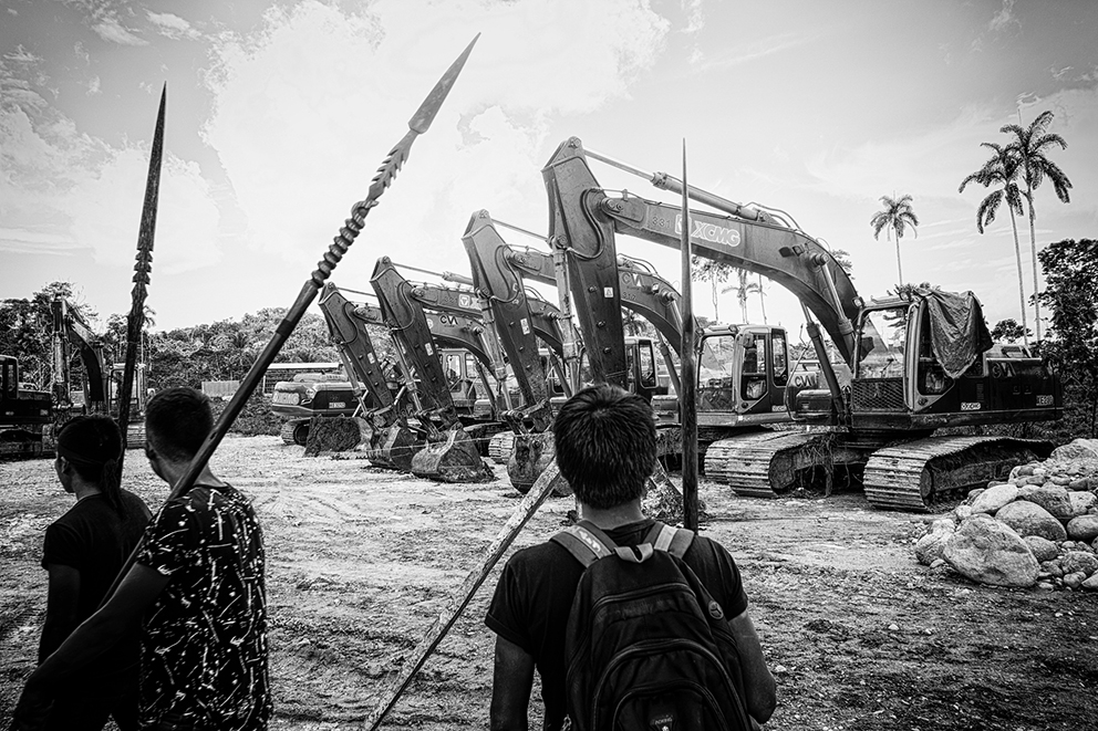 Un grupo de jóvenes Kichwas en Cantón de Santa Clara, Provincia de Pastaza, hace guardia para frenar el avance de los trabajos de construcción de la hidroeléctrica sobre el Río Piatúa, En este lugar los comuneros de la zona no tuvieron una consulta previa. La empresa Genefra empezó los trabajos preliminares, pero fue frenada gracias a la presión indígena en defensa de su río. La declaración indígena fue que quemarían una maquinaria diariamente hasta que la empresa se las llevara definitivamente del lugar.