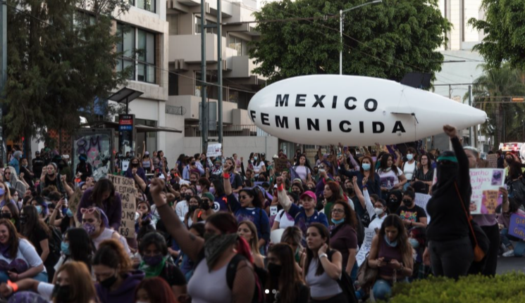 Las más de 15 mil mujeres que marcharon en Jalisco durante el #8M lo hicieron acompañadas de un globo dirigible creado por la artista Kiyo Gutiérrez, quien decidió plasmar en éste dos contundentes mensajes: “México feminicida” y “México transfeminicida”.