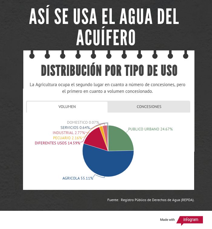 La agricultura ocupa el primer lugar en cuanto a volumen concesionado con 365 millones 902 mil 747 metros cúbicos de agua por año.