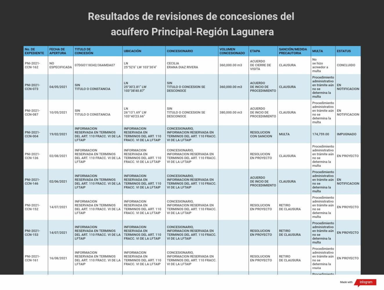 La autoridad especificó que, de esa cifra, sólo 10 corresponden al Acuífero Principal Región-Lagunera. Se abrió un expediente por cada uno de ellos. Sólo uno, el de la concesionaria Cecilia Eraña Díaz Rivera, aparece como concluido. El pozo fue clausurado. No se aplicó multa.